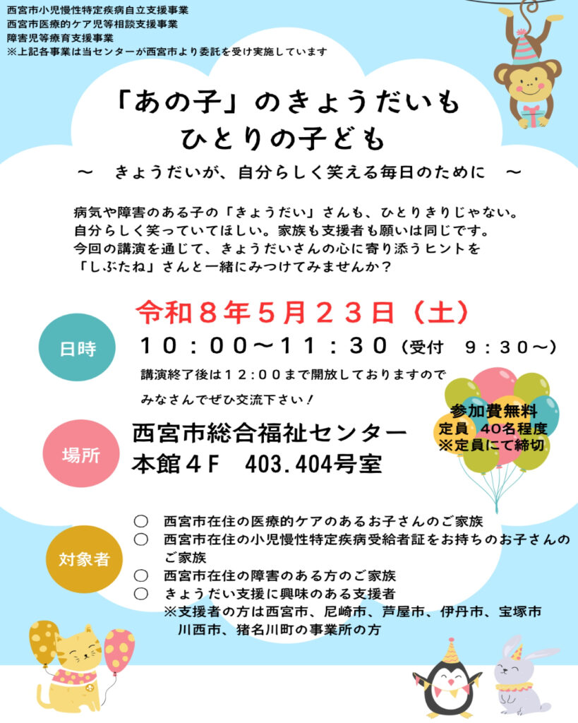 このたび、医療的ケア児等相談支援事業、小児慢性特定疾病児童等自立支援事業、障害児等療育支援事業として、「きょうだい児支援」をテーマにした講演会を開催いたします。