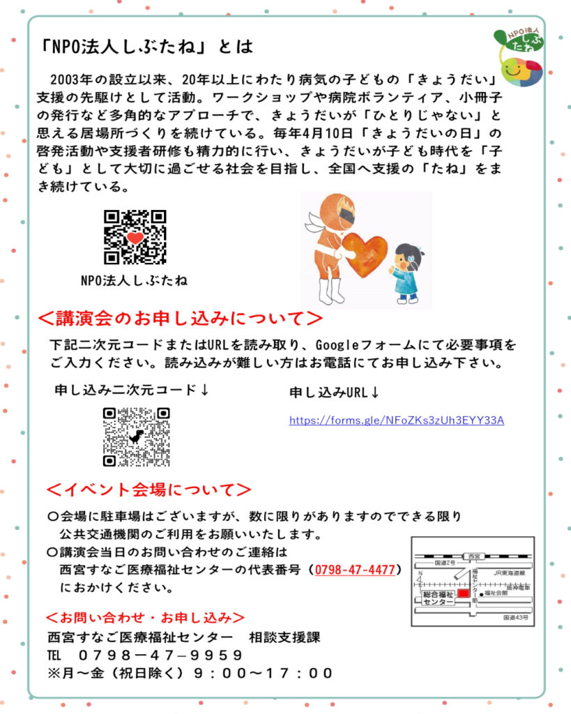 今回の講演会では、きょうだい支援に長年携わっておられる「NPO法人 しぶたね」さんをお招きして、きょうだいさんの心に寄り添うためのヒントを皆さんと一緒に考えていきます。病気や障害のあるお子さんのご家族、きょうだい児支援に関心がある支援者さん、「きょうだい」の気持ちへの理解を深めたい方々―――。一人で抱え込まず、まずは「知る」ことから始めてみませんか?